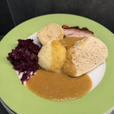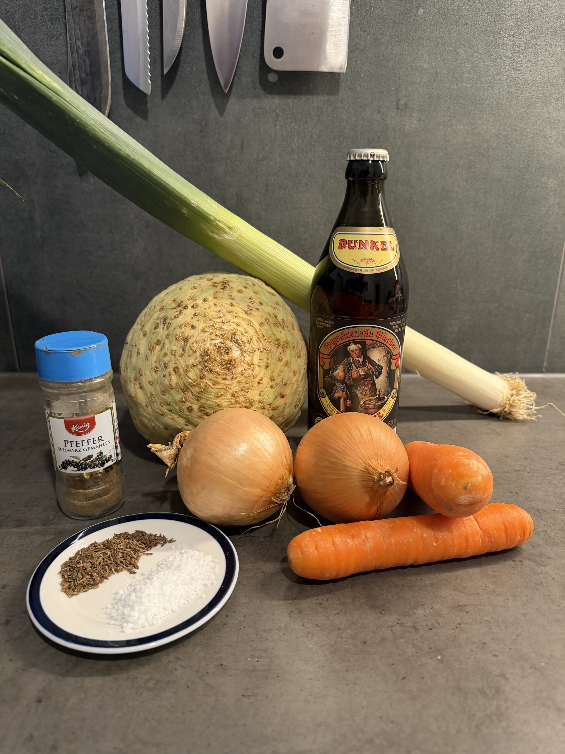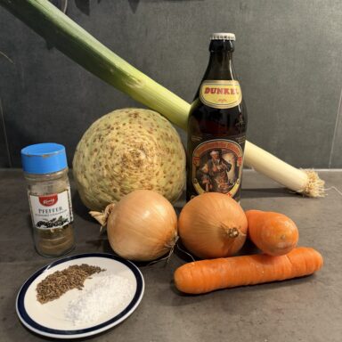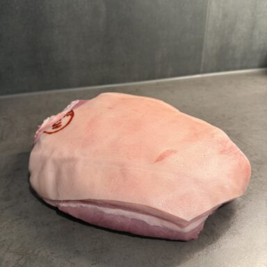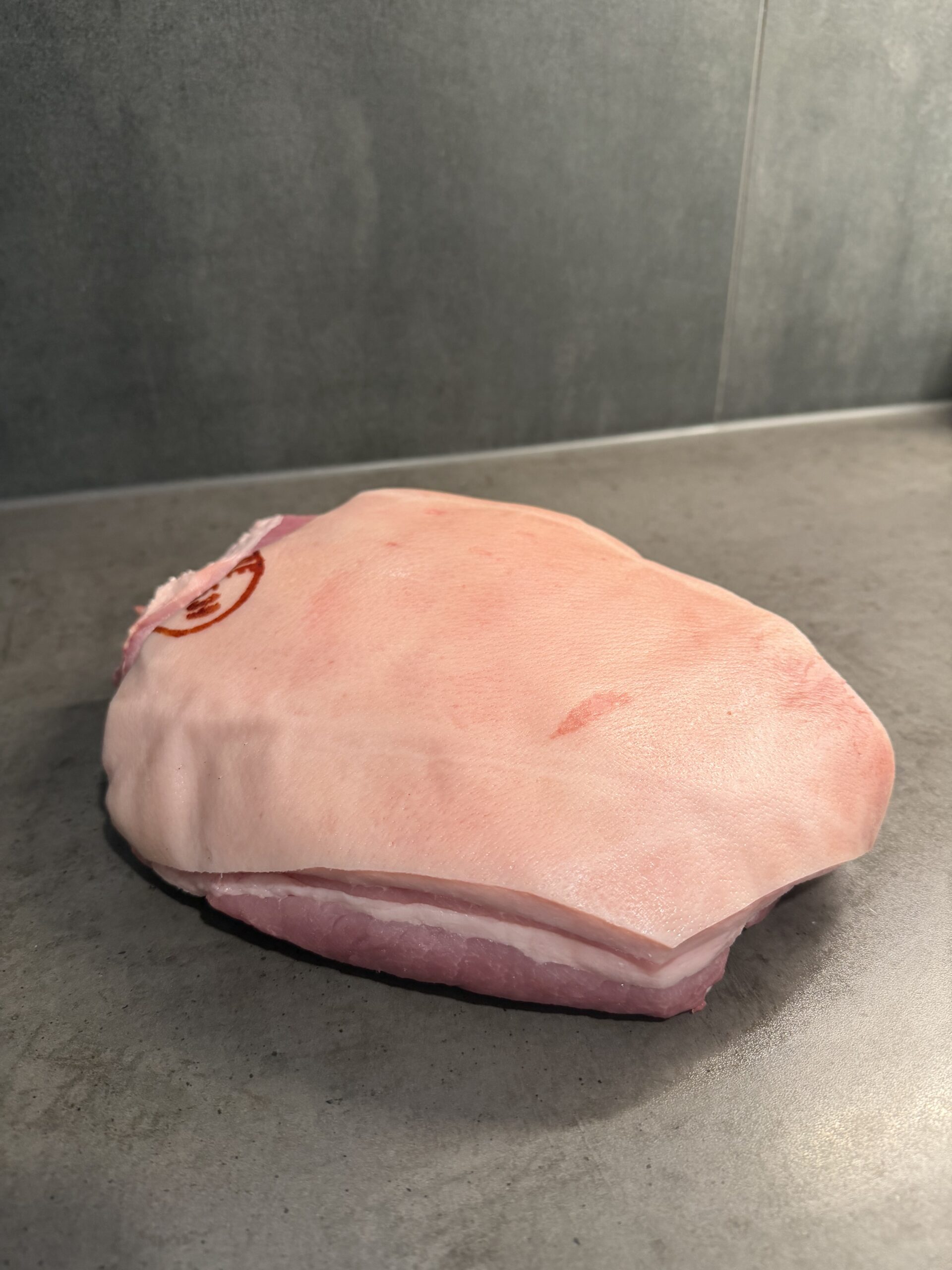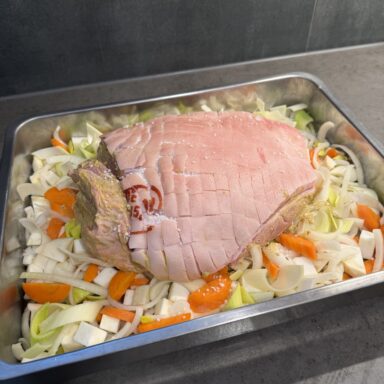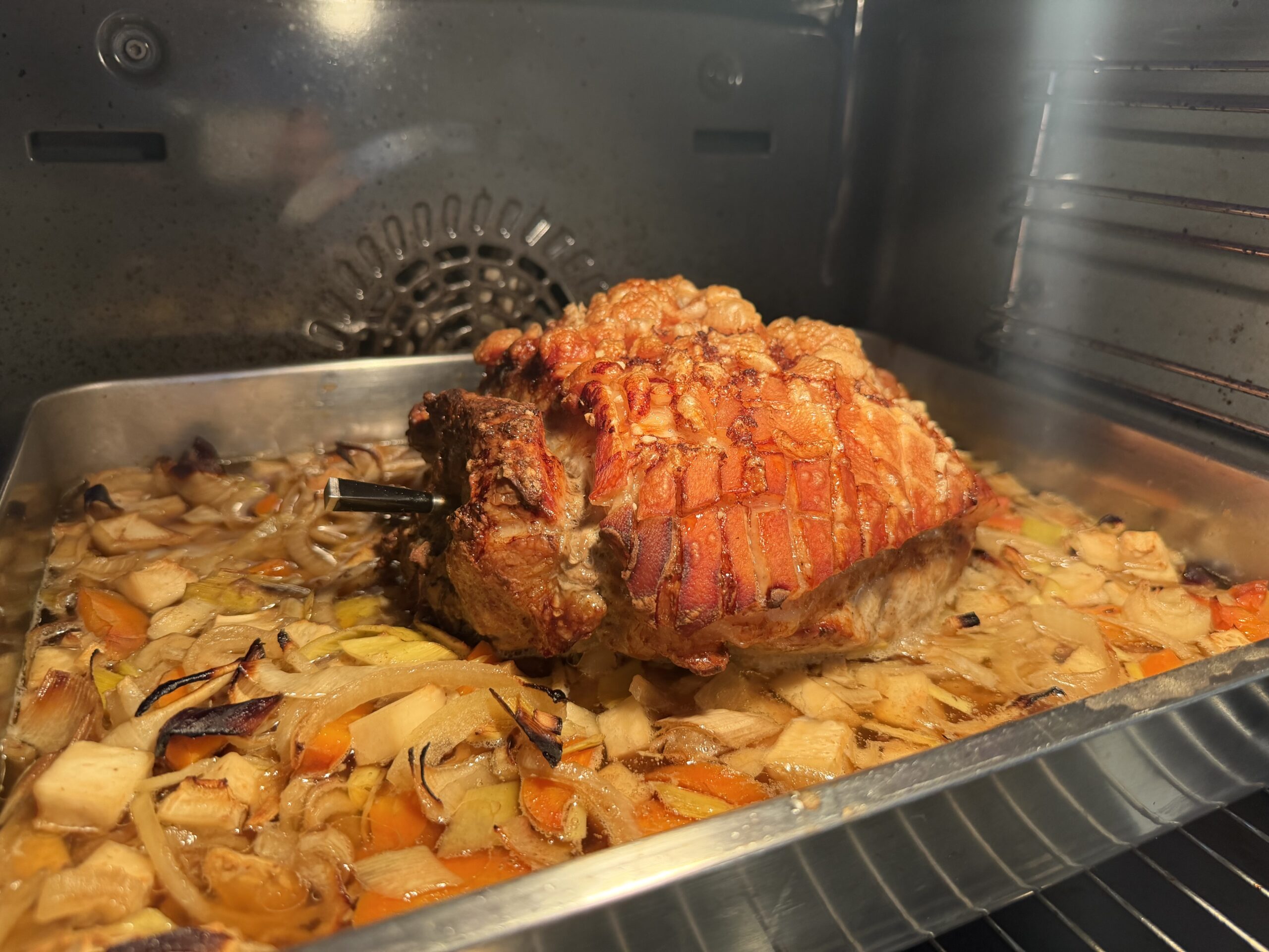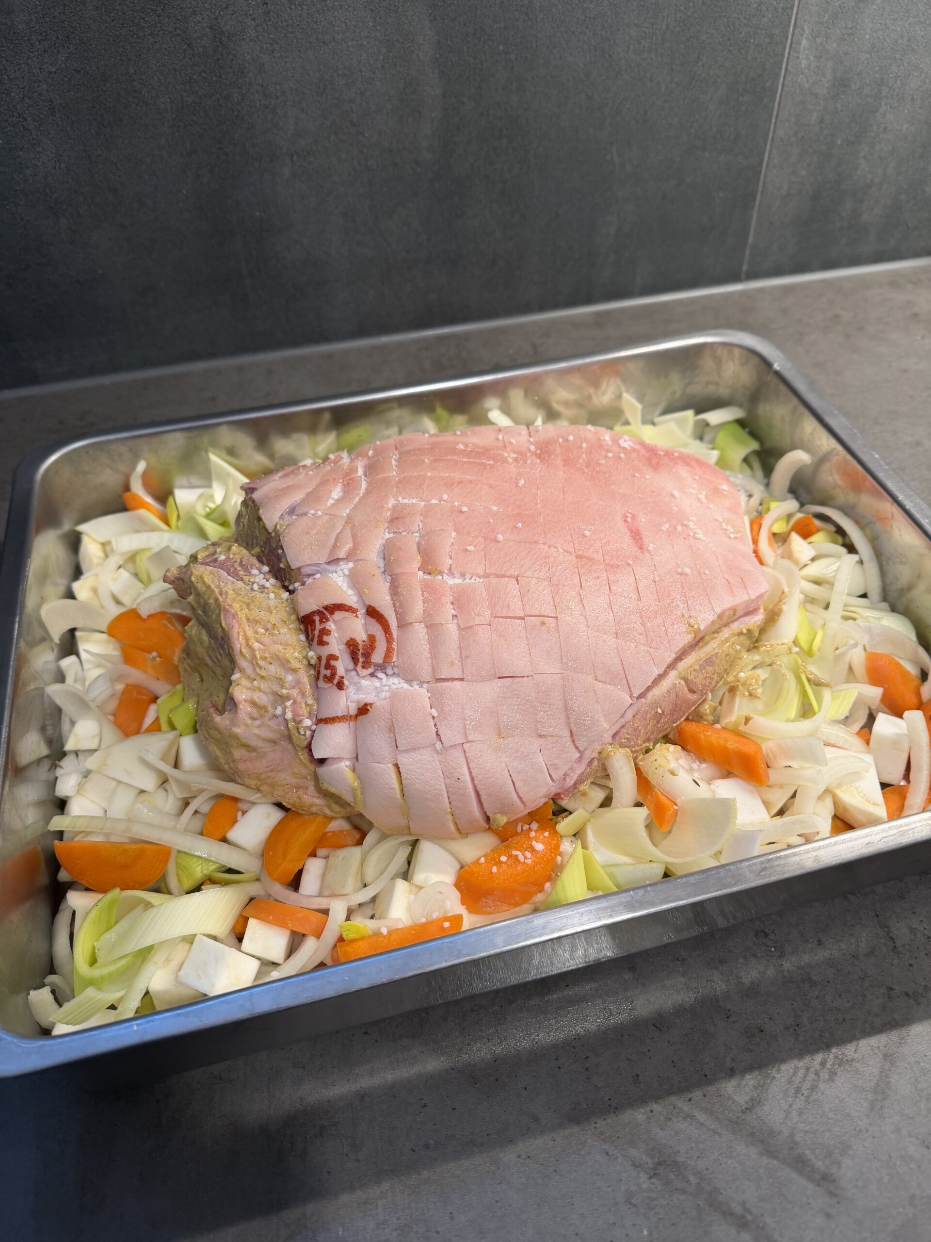 Krustenbraten mit knuspriger Schwarte auf Gemüsebett im Ofen